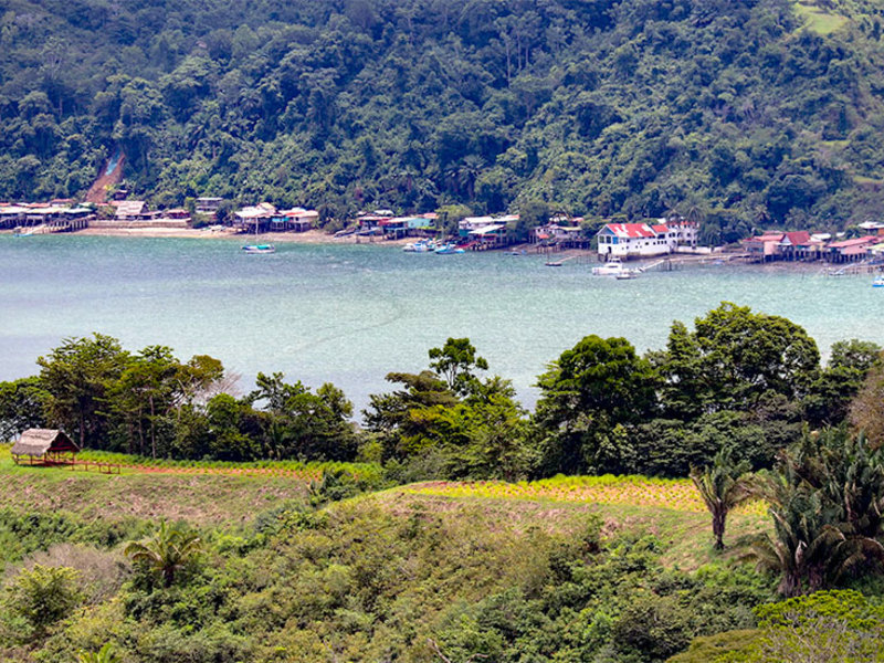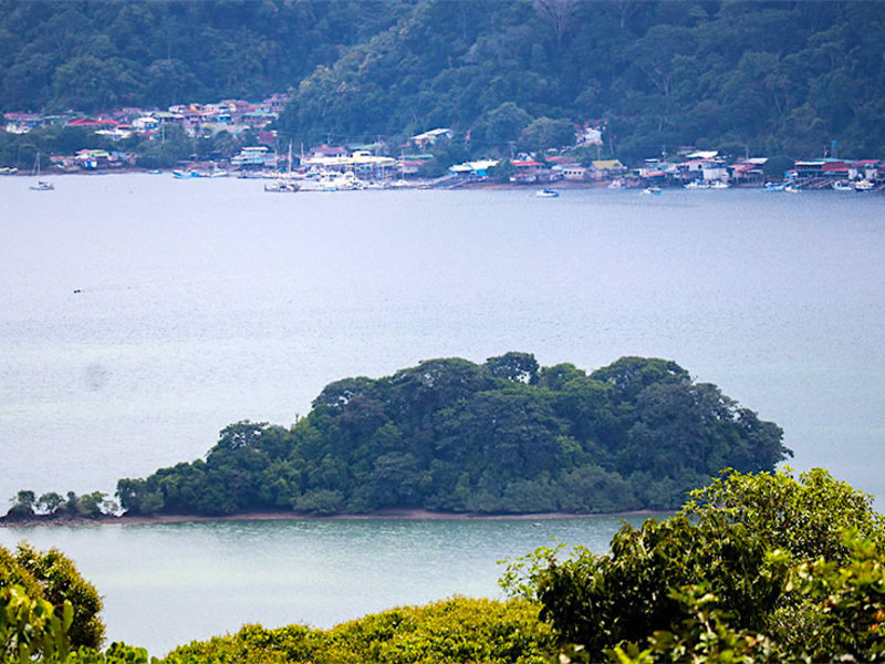 -A view to the east towards rainforest covered mountainsides, the historic bayfront town of Golfitoand the newly constructed Marina