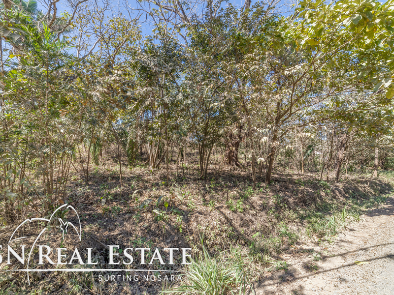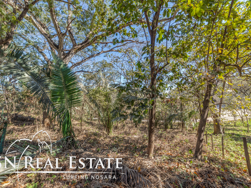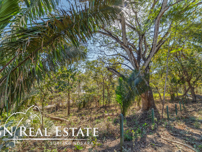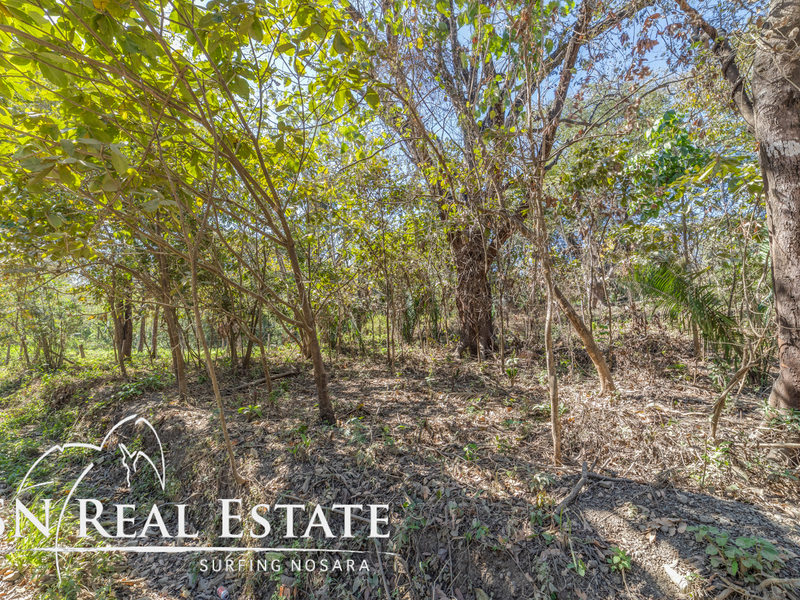 Beautiful, wooded, sloping lot with a huge tree providing canopy. Lot adjoins the main road to Playa Pelada and has water and electricity at the street level. Pelada beach is just a three minute walk from here. Commercial or residential use property.